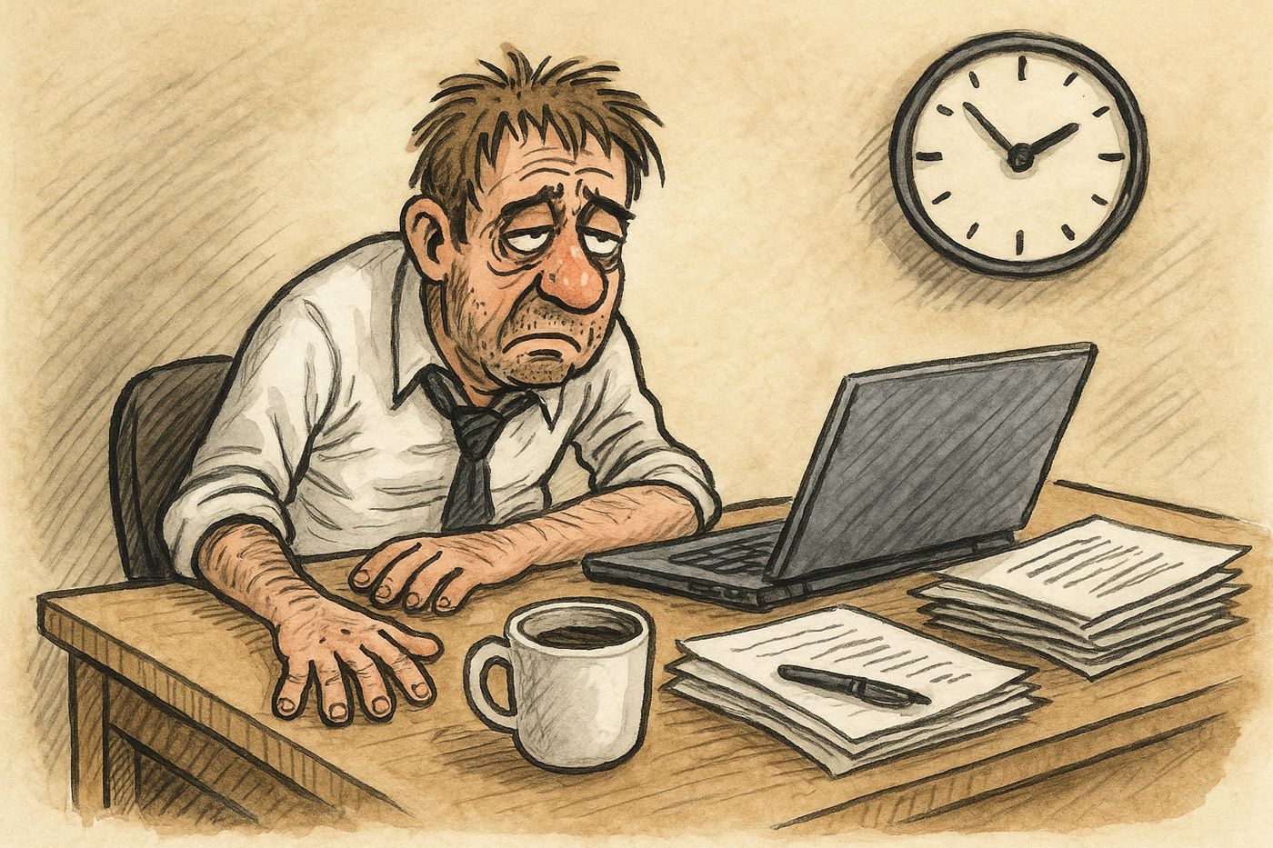8. Der Morgen danach: Regulärer Arbeitsbeginn; Kater kann Lohnfortzahlung gefährden, wenn selbst verschuldet.